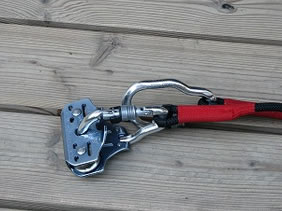 このシステムは「空中回廊」のコースの上に 10oのワイヤーがコースと平行に張ってあり、 そのワイヤーにPETZLのプーリーをカラビナで架けて、 墜落を防ぐ。 それともうひとつのビレイライン。 縄梯子を上るときも墜落防止のセルフビレイなど あちこちに安全対策が。 |