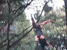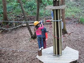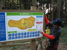 子どもたちと一緒にブリーフィングを受けます。 カラビナの使い方。縄梯子の上り方。 セルフビレイの取りかた。 ジップラインへの移りかたなどレクチャーを受けて ミニサイズのコースで再チェック。 OKをもらっていよいよスタート。 |
