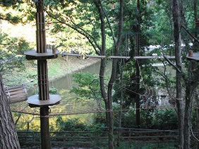 足場などのデザインやコースの取り方など 民間企業のアイデアには驚くものがあった。 樹上のステップに乗っていると、 スターウォーズの中に登場するイーウォックの村に 入ってきた気分になってくる。 |
