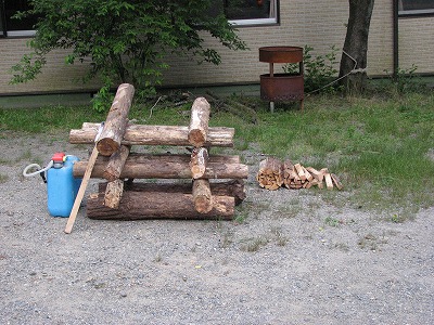 杉丸太を井桁に組んで、 中心部は太目の薪を並べてみました。 |