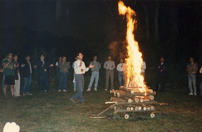 いよいよファイヤーが始まりました。 私が何かジャンケンの進行をしています。 点火に灯油などは使っていないものの、 枕木の油が燃えていて、炎が汚い。 |
